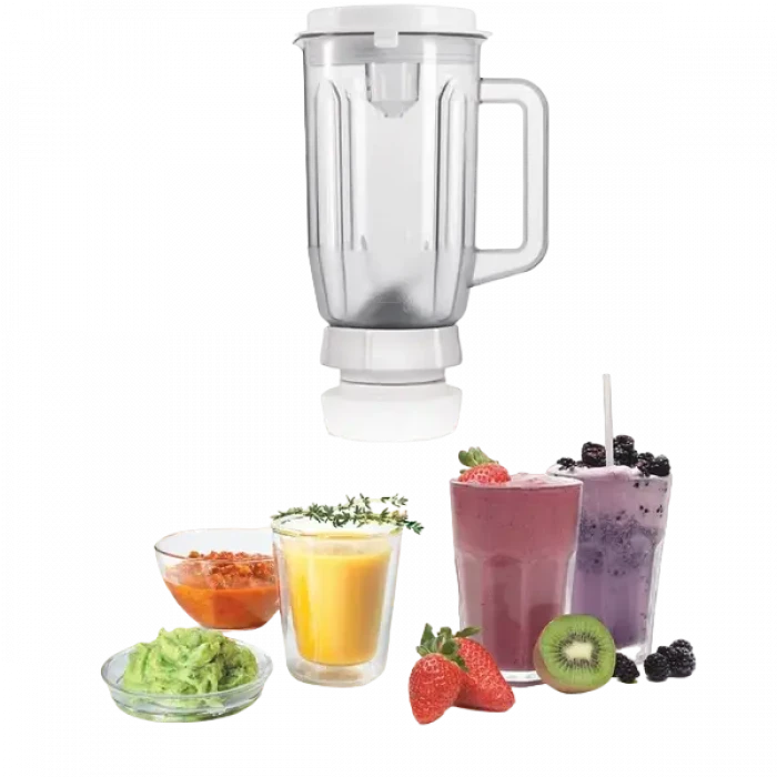cârlig pentru aluat, tel pentru amestecare, pentru bătut, tăietor universal cu 3 discuri, blender 1 l, tocat carne, presă de citrice, stand
