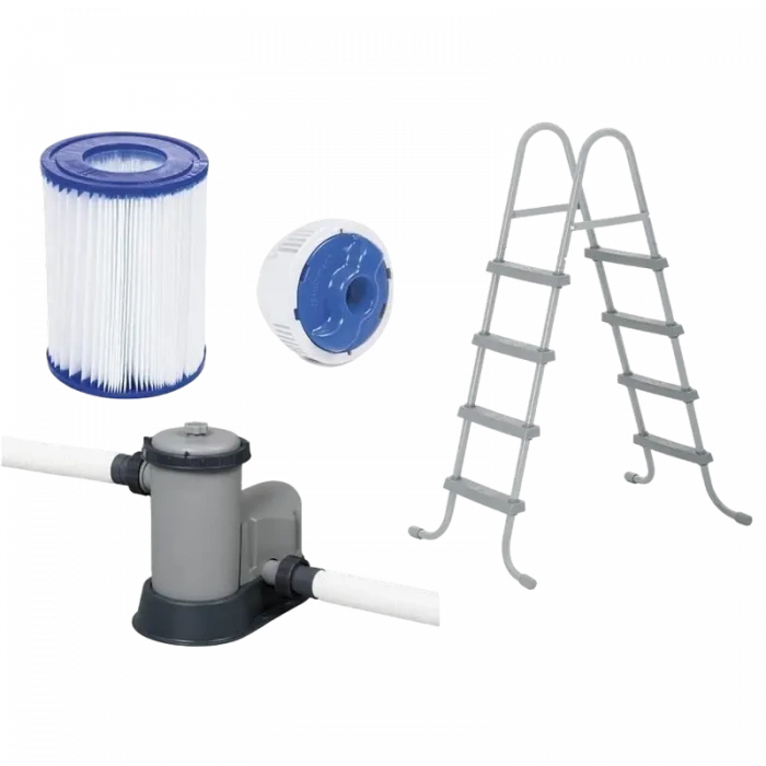 1x плавательный бассейн, 1x фильтр, 1x лестница,1x чехол для бассейнa