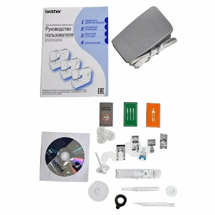 иглы, двойная игла, игла с закругленным остриём, шпульки, чехол (мягкий), распарыватель, катушкодержатель дополнительный, фиксатор катушки, щеточка для очистки, dvd